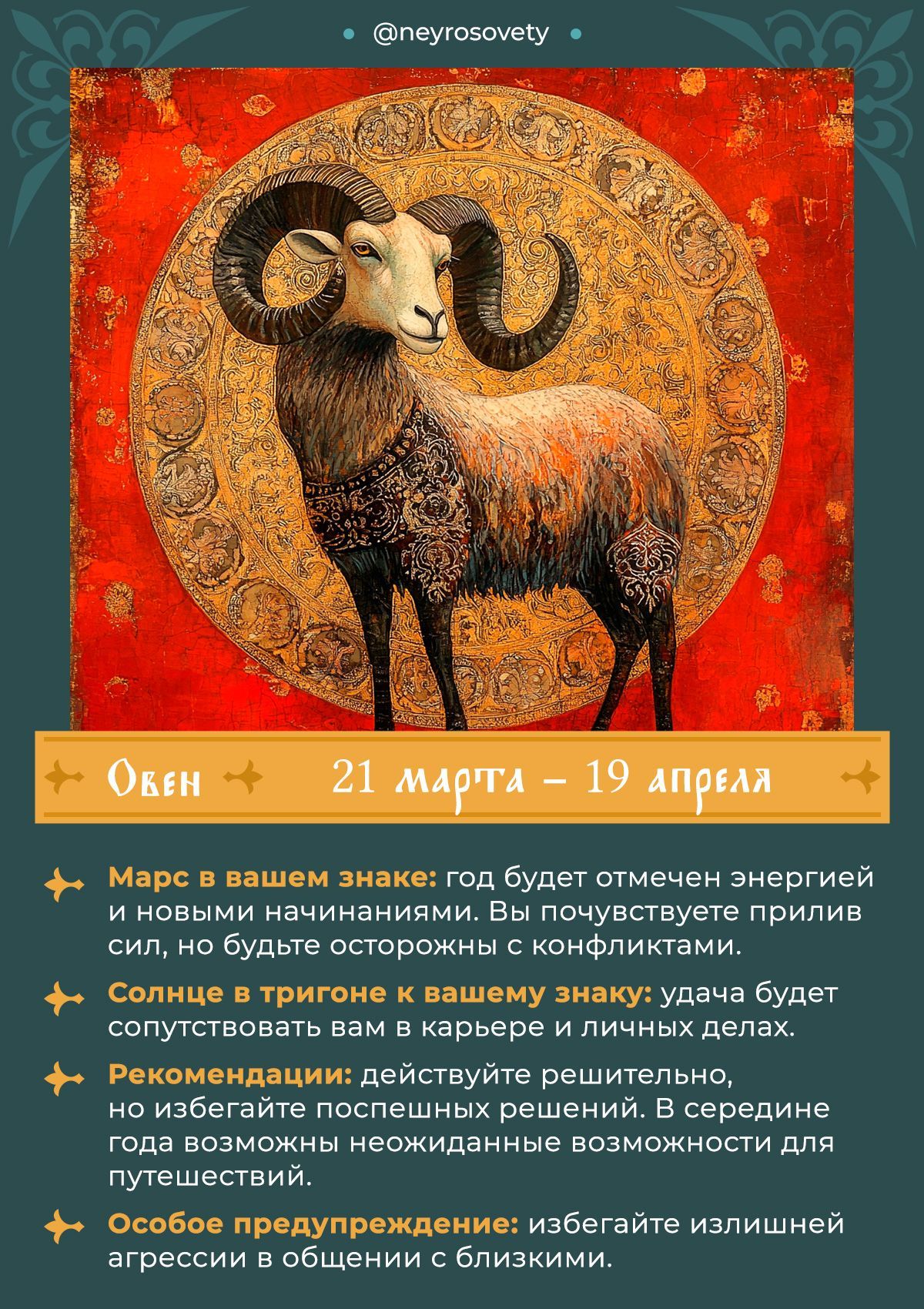 Марс в вашем знаке: Год будет отмечен энергией и новыми начинаниями. Вы почувствуете прилив сил, но будьте осторожны с конфликтами. Солнце в тригоне к вашему знаку: Удача будет сопутствовать вам в карьере и личных делах. Рекомендации: Действуйте решительно, но избегайте поспешных решений. В середине года возможны неожиданные возможности для путешествий. Особое предупреждение: Избегайте излишней агрессии в общении с близкими.