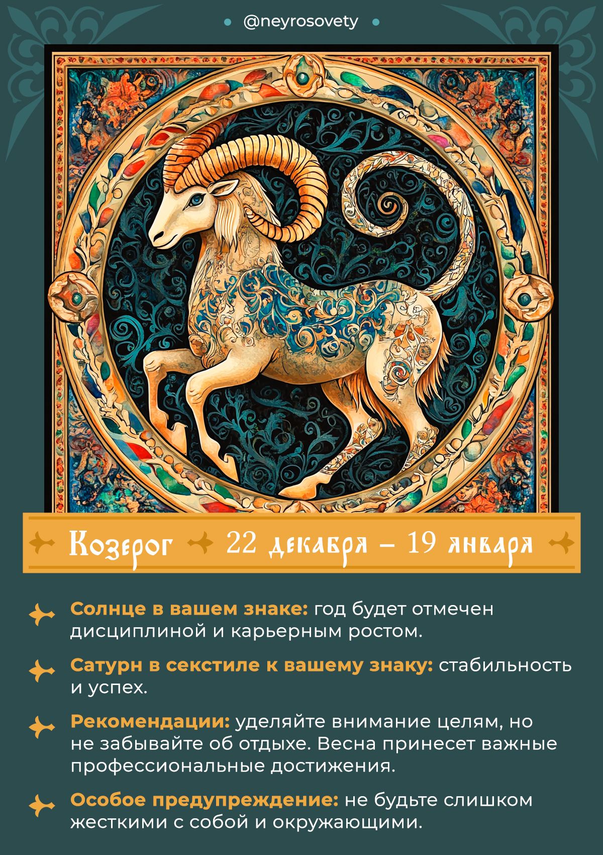 Солнце в вашем знаке: Год будет отмечен дисциплиной и карьерным ростом. Сатурн в секстиле к вашему знаку: Стабильность и успех. Рекомендации: Уделяйте внимание целям, но не забывайте об отдыхе. Весна принесет важные профессиональные достижения. Особое предупреждение: Не будьте слишком жесткими с собой и окружающими.
