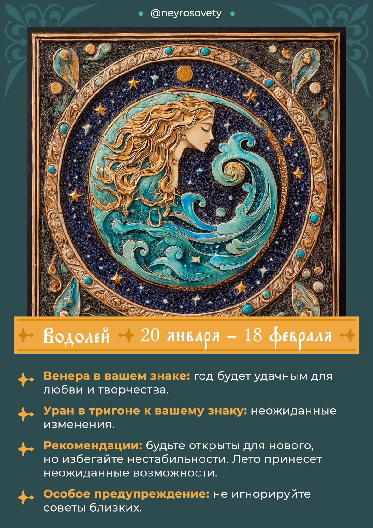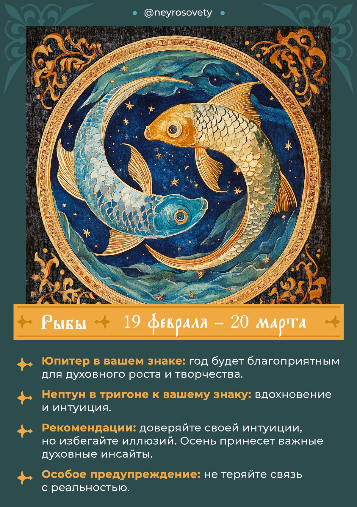 Юпитер в вашем знаке: Год будет благоприятным для духовного роста и творчества. Нептун в тригоне к вашему знаку: Вдохновение и интуиция. Рекомендации: Доверяйте своей интуиции, но избегайте иллюзий. Осень принесет важные духовные инсайты. Особое предупреждение: Не теряйте связь с реальностью.