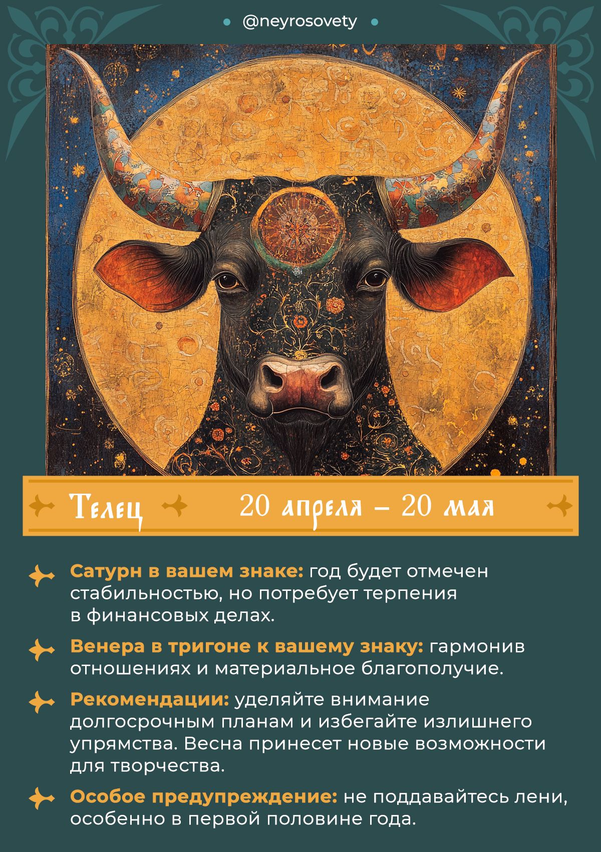 Сатурн в вашем знаке: Год будет отмечен стабильностью, но потребует терпения в финансовых делах. Венера в тригоне к вашему знаку: Гармония в отношениях и материальное благополучие. Рекомендации: Уделяйте внимание долгосрочным планам и избегайте излишнего упрямства. Весна принесет новые возможности для творчества. Особое предупреждение: Не поддавайтесь лени, особенно в первой половине года.