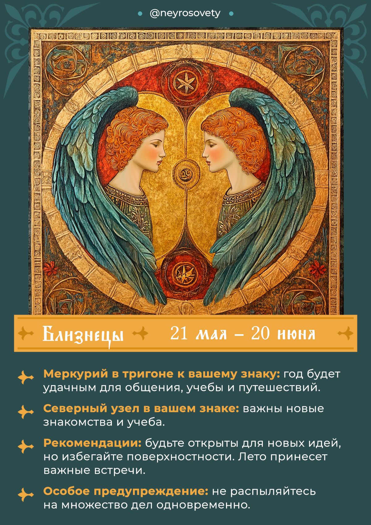 Меркурий в тригоне к вашему знаку: Год будет удачным для общения, учебы и путешествий. Северный узел в вашем знаке: Важны новые знакомства и учеба. Рекомендации: Будьте открыты для новых идей, но избегайте поверхностности. Лето принесет важные встречи. Особое предупреждение: Не распыляйтесь на множество дел одновременно.