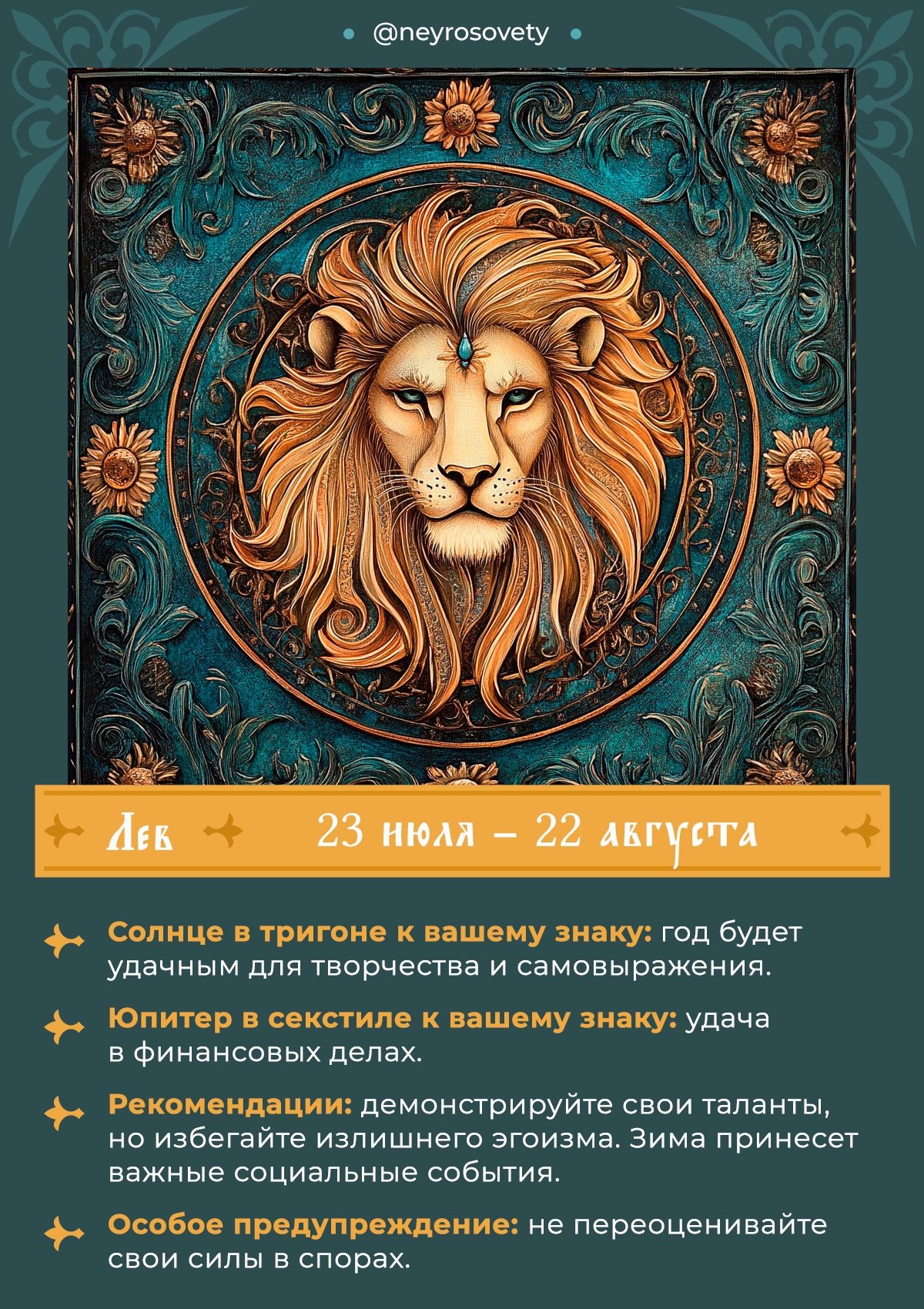 Солнце в тригоне к вашему знаку: Год будет удачным для творчества и самовыражения. Юпитер в секстиле к вашему знаку: Удача в финансовых делах. Рекомендации: Демонстрируйте свои таланты, но избегайте излишнего эгоизма. Зима принесет важные социальные события. Особое предупреждение: Не переоценивайте свои силы в спорах.