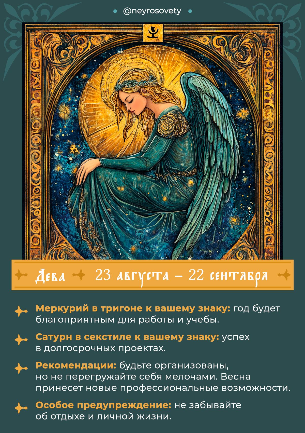 Меркурий в тригоне к вашему знаку: Год будет благоприятным для работы и учебы. Сатурн в секстиле к вашему знаку: Успех в долгосрочных проектах. Рекомендации: Будьте организованы, но не перегружайте себя мелочами. Весна принесет новые профессиональные возможности. Особое предупреждение: Не забывайте об отдыхе и личной жизни.