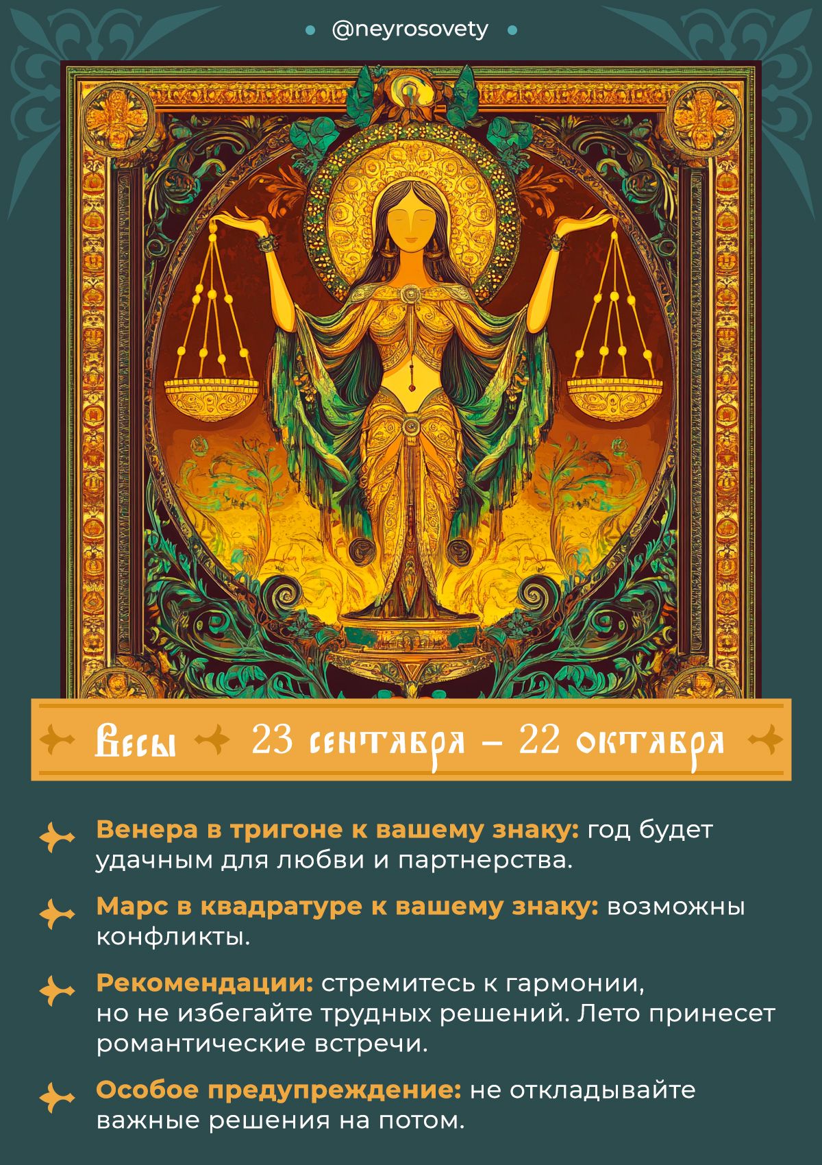 Венера в тригоне к вашему знаку: Год будет удачным для любви и партнерства. Марс в квадратуре к вашему знаку: Возможны конфликты. Рекомендации: Стремитесь к гармонии, но не избегайте трудных решений. Лето принесет романтические встречи. Особое предупреждение: Не откладывайте важные решения на потом.