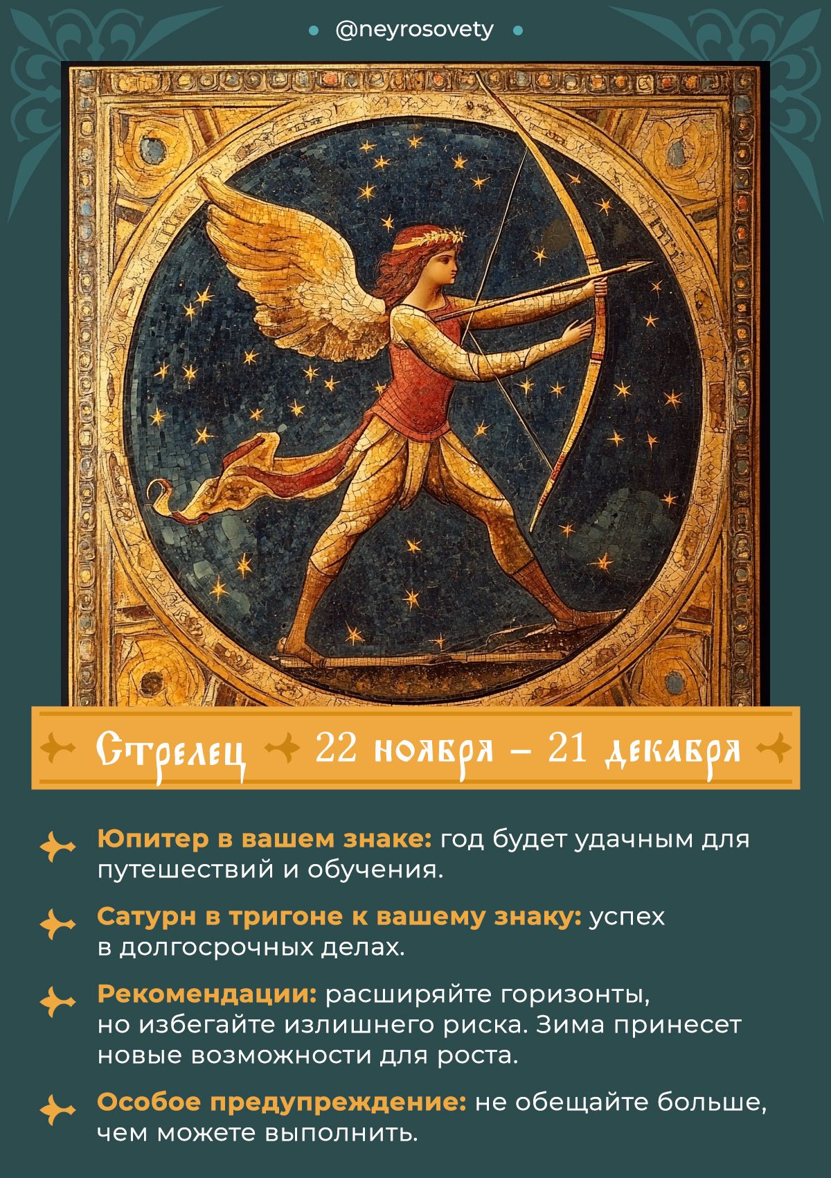 Юпитер в вашем знаке: Год будет удачным для путешествий и обучения. Сатурн в тригоне к вашему знаку: Успех в долгосрочных делах. Рекомендации: Расширяйте горизонты, но избегайте излишнего риска. Зима принесет новые возможности для роста. Особое предупреждение: Не обещайте больше, чем можете выполнить.