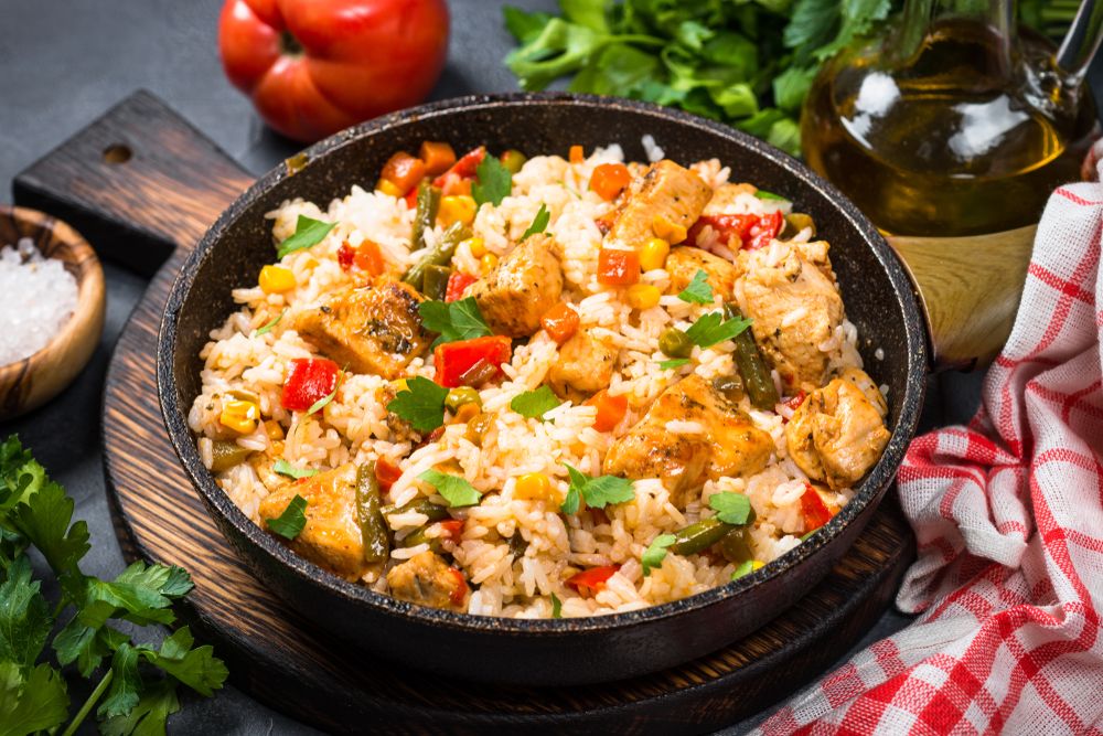 Жареный рис с курицей, овощами и яйцом