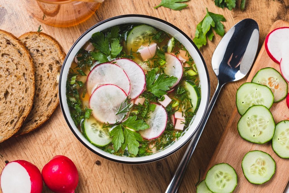 - Смешайте овощи и зелень, заправьте квасом, добавьте соль и сок лимона.
